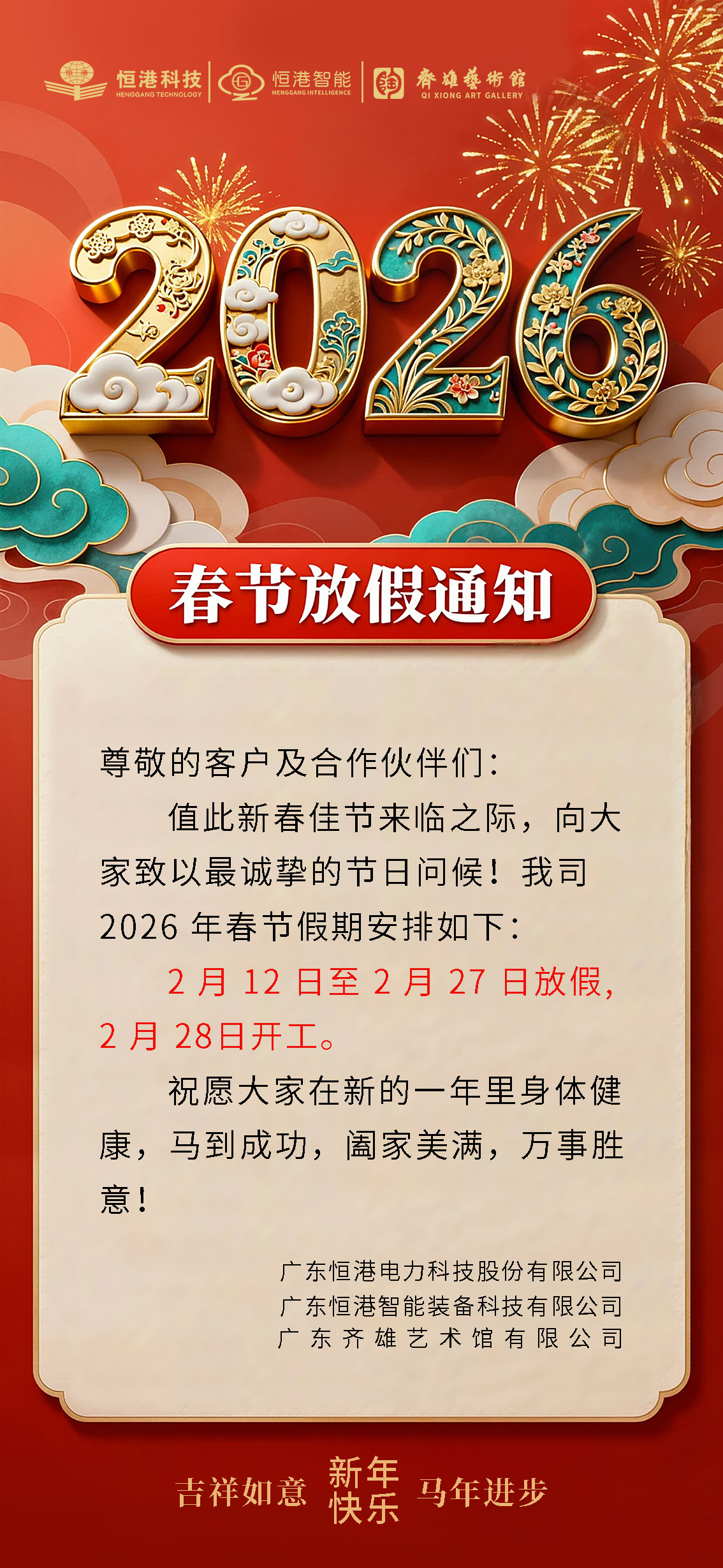 根据《国务院办公厅关于2026年春节放假安排的通知》,结合我司实际情况,我司春节假期时间安排为:2月12日(农历腊月廿五)至2月28日(农历正月十二)。