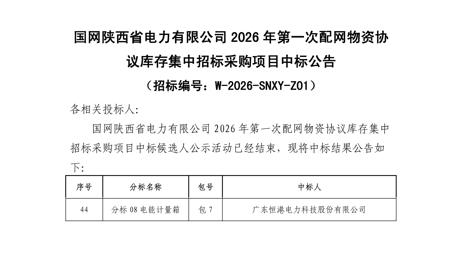 策马争先启新程,实干笃行创佳绩!2026年3月27日,国网陕西省电力有限公司 2026 年第一次配网物资协议库存集中招标采购项目中标结果公示,我司成功中标该项目 “电能计量箱” 标段,喜夺马年市场开拓开门红。此次中标,凝聚着全体恒港人的拼搏与付出。未来我们将继续携手共进、砥砺奋进,以实干再创佳绩、再攀新高!
